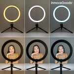 Täydellinen ja monipuolinen monikäyttöinen soitonvalaisin, joka sopii ihanteellisesti selfieihin, videotallenteisiin, suoriin lähetyksiin, videopuheluihin, meikkisessioihin jne. Se parantaa valaistuksen ja kuvan laatua sekä tarjoaa optimaaliset ja ammattimaisemmat tulokset. Siinä on 120 LED-valoa, joissa on 3 valoasetusta (valkoinen, keskikokoinen ja lämmin valo) ja 10 intensiteettitasoa, joten voit myös säätää valon kirkkautta. Bluetooth-kaukosäädin toimii laukaisimena kuvien ottamiseen tai tallennuksen aloittamiseen kätevämmin (toimii 1 CR2032-paristolla mukana). Mukana tulee myös jalusta kiinteällä jalustalla ja 360º pyörivällä pallomaisella päällä, joten se on helppo asettaa haluttuun asentoon. Mukana on myös joustava älypuhelinteline useilla asennoilla, jotka voidaan säätää mihin tahansa matkapuhelimeen tai mihin tahansa asentoon. Tämä rengaslamppu on erittäin helppokäyttöinen, se on kytkettävä USB-virtalähteeseen ja kaapelissa on 4 kosketuspainiketta, joilla voit valita erilaisia käytettävissä olevia asetuksia (päälle / pois, voimakkuus ja valoasetukset).