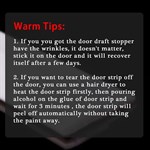 Mittaa vain ovesi leveys, leikkaa lista sopivan kokoiseksi ja vedä liiman takaosa ja kiinnitä se oveen! Esilämmitä myös nauha hiustenkuivaajalla, jotta se tarttuu hyvin.
