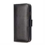 Kotelo sulkeutuu magneettikiinnikkeellä ja sisältää jalustatoiminnon, jonka ansiosta puhelin on helppo asettaa kyljelleen.